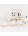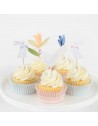 24 toppers em 5 designs e forminhas de papel em 2 cores diferentes.