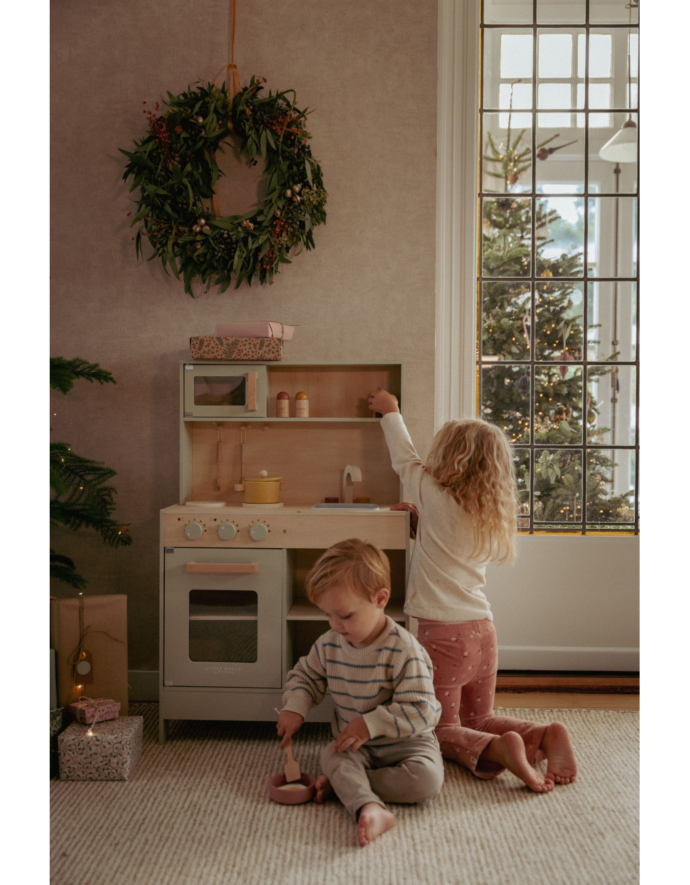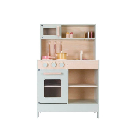 Os pequenos cozinheiros podem pôr as mãos na massa com esta adorável cozinha de madeira na cor menta! Podem preparar um delicioso bolo no forno, cozinhar legumes frescos no fogão ou fritar um ovo na frigideira.